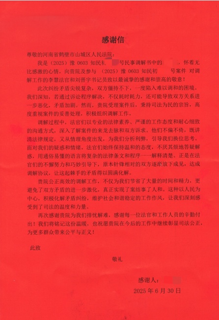 2025年6月30日,山城区法院收到一封来自被告王某某的感谢信,王某某虽然支付了赔偿款,但对承办法官和书记员的工作态度和调解工作表示满意,送上一封感谢信表达感谢。