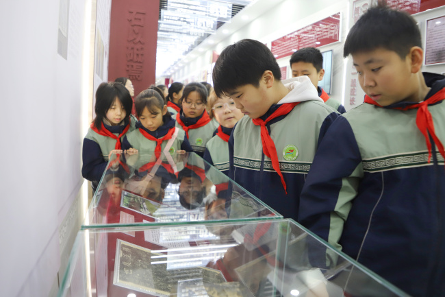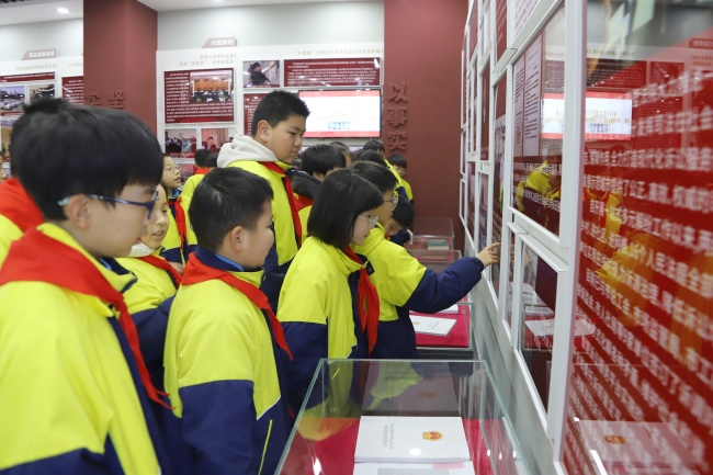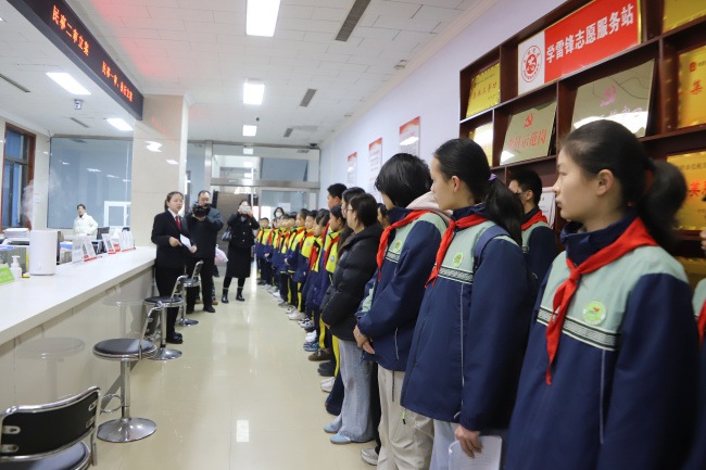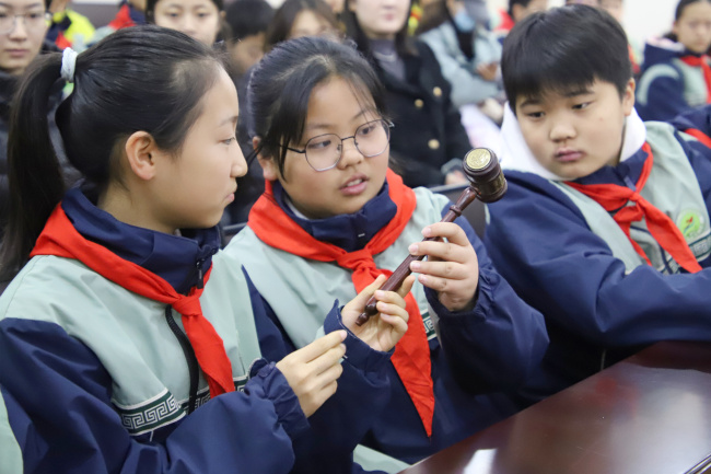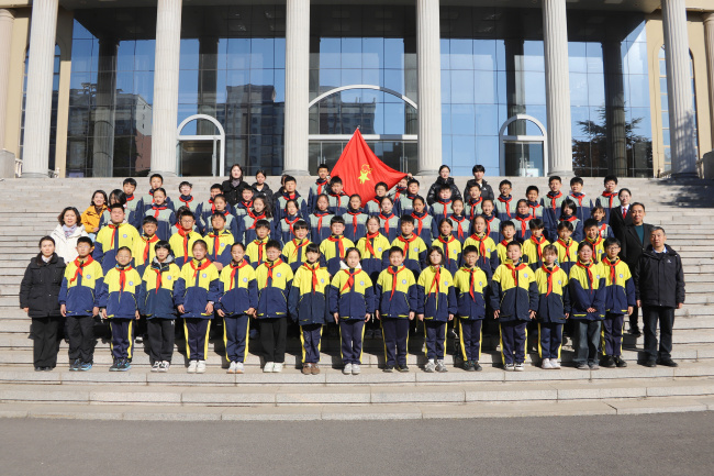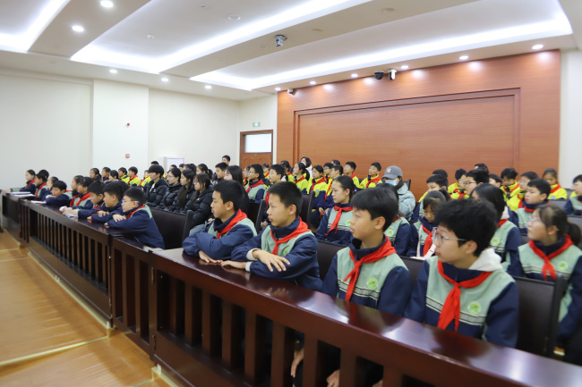 上午9时,同学们在审判楼前列队,讲解员用童趣语言带领大家走进诉讼服务中心,体验自助立案、跨域立案等智慧法院建设成果。随后拾级而上院史馆,讲解员从“獬豸”这一中国上古“法兽”开讲,溯源“灋”字中“水”“廌”“去”的深层寓意,介绍了鹤壁法院的发展史,让同学们真切感受一代代鹤壁法院人拼搏进取的精神血脉。
