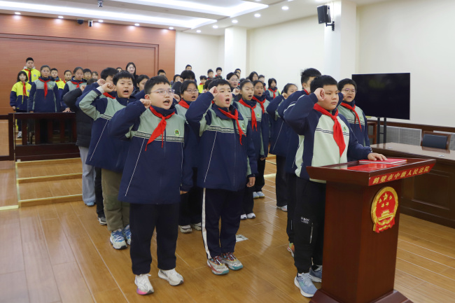 模拟法庭结束,普法志愿者通过互动问答、知识讲解等形式,讲解了宪法的地位和核心内容,介绍了宪法宣誓制度及其意义,让抽象的法律知识变得可感可触。活动最后,同学们纷纷对“宪法宣誓”跃跃欲试,在普法志愿者的指导下,同学们面对国徽,举起右拳庄严宣誓,铿锵有力的誓言回荡在法庭上空,既饱含着对宪法的敬畏之心,更传递了新时代少年“学法、懂法、守法、用法”的坚定信念。