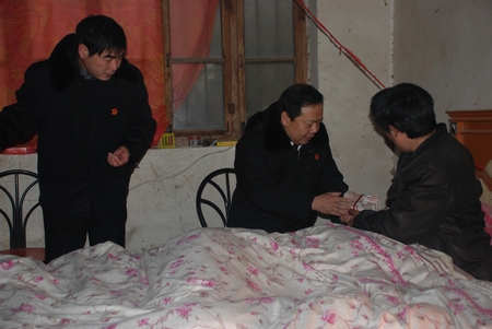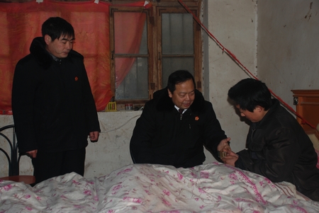 12月28日上午,鹤壁市中级人民法院党组书记、院长曲海滨冒着严寒,为浚县东善堂村受伤农民工李志波送去赔偿款37万元,深受群众好评。