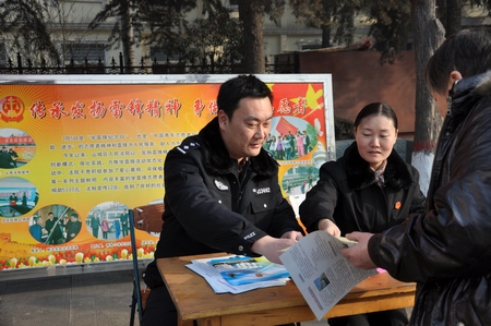 鹤壁市山城区法院干警将继续发扬新时期的雷锋精神:爱岗敬业、忠诚守信、服务群众、奉献社会。3月5日,他们以自己的实际行动组织起来,走上街头开展法律宣传活动,将雷锋精神代代流传下去,请辖区居民见证:将争做“雷锋式”的好法官、好干警。