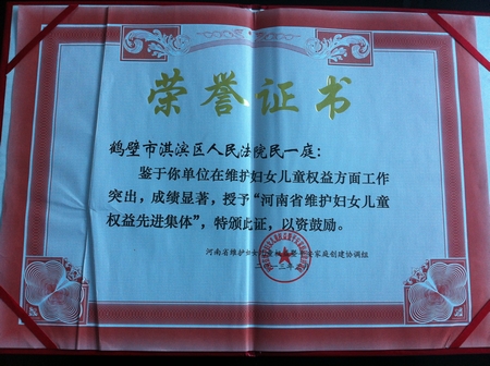 4月24日,鹤壁市淇滨区人民法院民一庭被河南省维护妇女儿童权益暨平安家庭创建协调组授予“河南省维护妇女儿童权益先进集体”,该项荣誉系该庭2013年以来荣获的第三项省级荣誉。