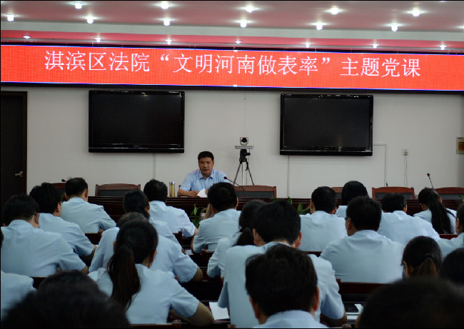 淇滨区法院为深入开展党的群众路线教育实践活动,引导全院党员不断增强文明意识,提升文明素质,7月8日下午,该院党组书记、院长薄报亮以“文明河南做表率,司法为民做先锋”为主题给全院党员上了一堂专题党课。