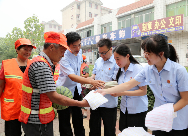 夏季烈日炎炎,鹤壁中院志愿者服务队积极开展“送清凉 送法律”活动。7月31日,十余名志愿者向高温期间仍奋战在一线的环卫工人们送去了西瓜、矿泉水、毛巾等防暑降温用品。