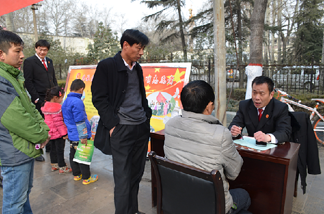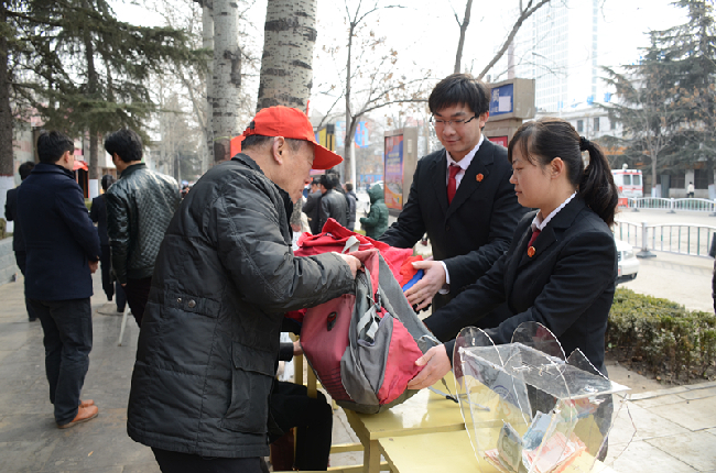 一大早,山城法院干警就在街头悬挂条幅、摆放展板、设立展台,义务为过往的群众发送宣传资料,提供法律咨询,讲解法律知识。杨法官是多年从事民事审判实践的一名法官,在展台前,他耐心的为一名群众讲解合同法的有关问题,直到对方满意为止,看着对方心满意足的离开,杨法官的心里深感欣慰。同时,为响应区里捐款捐物的号召,法院干警带着全院干警的心意,将衣服、课本、书包等共计86件捐献给困难儿童。
