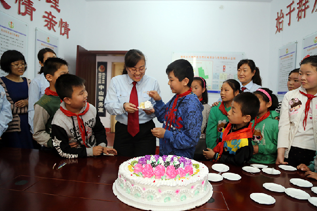 活动当天,恰逢居住在该社区内的梁丰泉小朋友十三岁的生日,考虑到梁丰泉的爸爸妈妈不在身边,鹤山区法院的法官妈妈们便在馨苑社区为他举办了一个温馨热闹的生日聚会,并邀请了诸多留守儿童们一起参加,法官妈妈们还与孩子们一起做游戏、吹蜡烛,切蛋糕、分礼物。