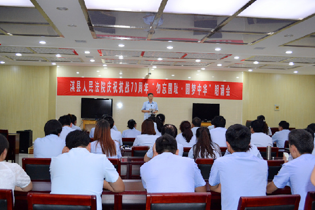 为进一步弘扬民族精神,唱响和平与发展的时代主旋律,8月27日下午,淇县法院以“勿忘国耻•圆梦中华”为主题举行纪念抗战胜利70周年朗诵会。朗诵会共有两项议程,一是院内各庭室12名干警精彩朗诵,二是全院干警共同观看抗战电影《夜袭》。