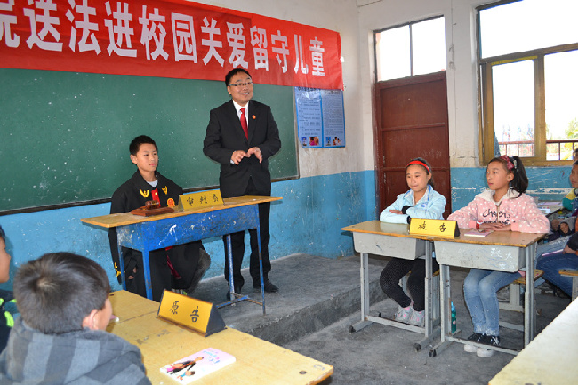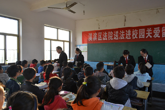 活动一开始,淇滨区法院的法官们给福营学校100余名留守儿童送去了由河南省高院与报业集团携手,编辑出版的“送法进校园”第三季留守儿童心理励志普法漫画书《留守的心灵不孤单》。并结合留守儿童的学习生活特征,以《预防未成年人犯罪法》、《未成年人权益保护法》涉及未成年人基本权益的法律入手,采用灵活、诙谐的方式和语言为孩子们讲解漫画书中的案例、法律知识。在此期间法官还和孩子们进行交流、互动,不时穿插一些有趣的故事,引得孩子们在欢声笑语中认识了法律,将近两个小时的法制教育课在一片热烈的掌声中圆满结束。法制教育课结束后,该院的法官还特地挑选了留守儿童受伤害的案例,现场进行模拟开庭,并挑选5名学生参与其中,有的充当审判员、有的充当原告或者被告,在法官的亲切指导下,完成了此次模拟开庭。该院法官希望孩子们通过这样的近距离参与开庭,能够加深法律意识,学会用法律武器保护自己的合法权益,对身边的违法行为说不,做文明守法、积极向上的好学生。