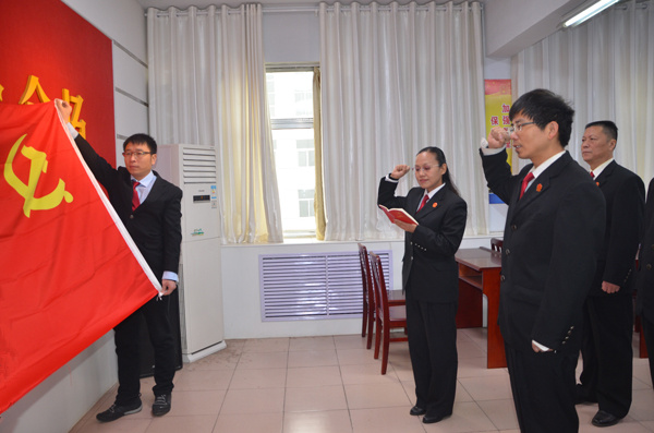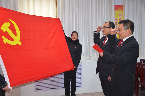 2015年12月24日上午,鹤山区法院举行了预备党员宣誓仪式。宣誓仪式由党总支委员戚秀丽同志主持,在党总支委员尤文广同志的领誓下,预备党员付红民、杨焕朝面对党旗举起右手,进行了庄严且神圣的入党宣誓。