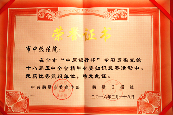 3月10日,鹤壁中院在1月底市委宣传部组织开展的党的十八届五中全会精神知识竞赛活动中喜获佳绩,将优秀组织奖、一等奖、二等奖、三等奖等多个奖项收获囊中。
