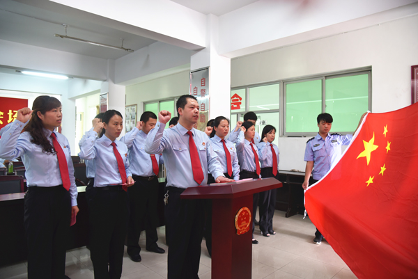 5月20日下午,浚县法院举行新任命人员宪法宣誓仪式。17名新经县人大常委会任命人员紧握右拳面向国旗集体宣誓,用铮铮誓言作出庄严承诺。
