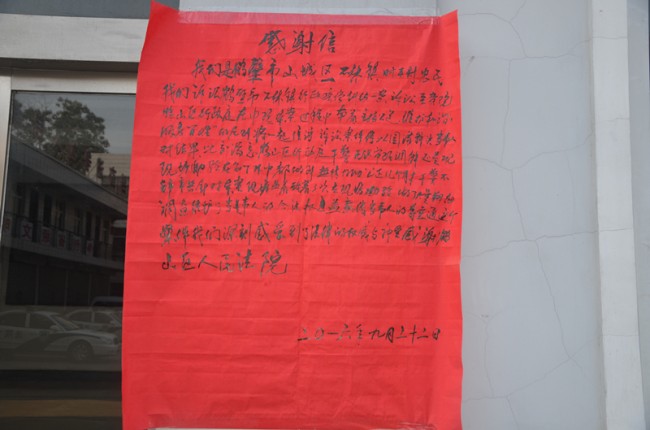 感谢信是用农家自己裁的大红纸写的,粗重的笔迹力透纸背,字体歪歪扭扭,纸面却十分整洁。张爱香法官见惯了打印版的感谢信,顿时感到这封粗朴的感谢信的份量与众不同。寥寥数百字,满满感激情,原告的心意自是一目了然。收到感谢信的张法官说自己也很感谢当事人,感谢他对法官工作的理解、信任,有了当事人的支持,感觉自己再苦再累也值得了。