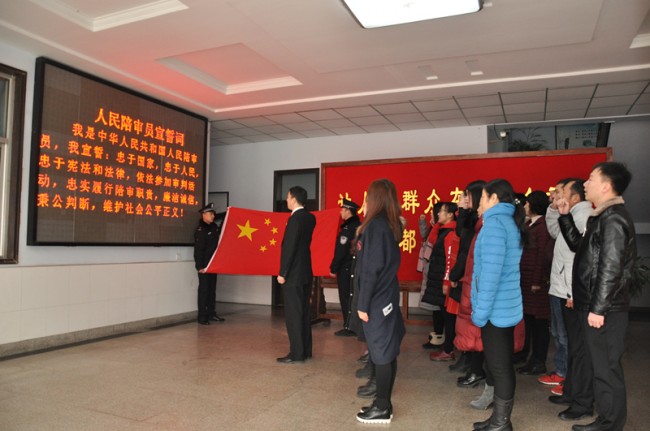 “我是中华人民共和国人民陪审员,我宣誓:忠于国家,忠于人民,忠于宪法和法律,依法参加审判活动,忠实履行陪审职责,廉洁诚信,秉公判断,维护社会公平正义!”2月3日上午,淇滨区法院举行了新任人民陪审员公开宣誓仪式,20名通过层层选拨被淇滨区人大常委会新任命的人民陪审员举起右手、面向国旗,集体宣誓。