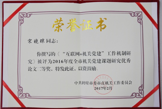 淇滨区法院宋晓琼同志撰写的《“互联网+机关党建”工作机制研究》一文,被评为2016年度全市机关党建课题研究优秀论文二等奖。该论文是全市法院系统唯一入选的获奖论文。