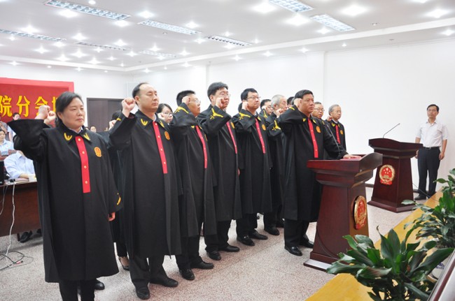 下午4点30分,宣誓仪式正式开始。张保平主任首先宣读了员额法官任职文件。在奏唱国歌之后,24名员额法官在院党组书记、院长薄报亮的领誓下面向国旗,身穿法袍,高举右拳,庄严宣誓:“忠于中华人民共和国宪法,维护宪法权威,履行法定职责,忠于祖国、忠于人民、恪尽职守、廉洁奉公。接受人民监督,为建设富强、民主、文明、和谐的社会主义国家努力奋斗!”