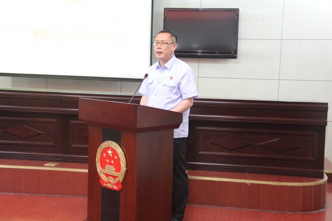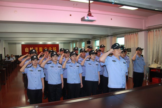 为增强司法警察履行职责的荣誉感和自豪感,2017年6月 5 日上午11点,山城区法院举行司法警察重温入警宣誓誓词仪式。宣誓仪式由山城区法院党组副书记、主管法警队工作的副院长卢国平主持,院党组成员、各部门负责人、执行局干警和全体司法警察参加了仪式。