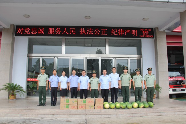 7月28日上午,在“八一”建军节到来之际,鹤壁中院党组成员、副院长袁希利及两名军转干部代表,在山城区法院党组书记、院长吕文涛及其他党组成员的陪同下,来到山城区消防大队进行慰问,并送去了西瓜、水等慰问品,受到了消防官兵的热烈欢迎。