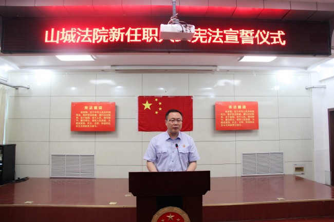 山城区法院党组书记、院长吕文涛作了重要讲话。他对新任职人员提出了殷切希望:参加这次宣誓的同志,要永远铭记誓言、切实履行承诺,始终忠于宪法、遵守宪法、维护宪法,自觉接受人民群众和人大代表的监督,不辱神圣使命,不负人民重托。在工作岗位上严格依宪依法办事,做宪法和法律的忠实崇尚者、自觉遵守者、坚定捍卫者,以更加饱满的政治热情和强烈的担当精神,为山城区法院大集体的团结,提升不断创造新业绩。