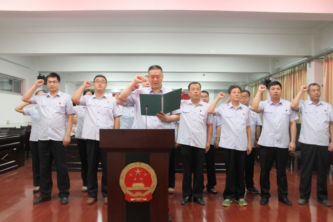 下午三点三十分,宣誓仪式正式开始。奏唱国歌之后,山城区法院政治处副主任张志伟宣读了人大决议。随后,党组成员、执行局局长邓海兵领誓,18名新任职人员举拳过肩,面向国旗,庄严宣誓。宣誓完毕,新任职的民一庭庭长唐建作了表态发言。院党组成员、纪检组长王赵生对新任职人员进行了集体廉政谈话。