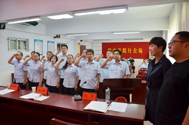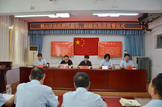 8月11日下午,鹤山区法院在北三楼会议室举行隆重而庄严的新任职庭长、副庭长宪法宣誓仪式。鹤山区人大副主任秦新娥、政法委副书记游国峰应邀出席宣誓仪式并进行监督。仪式由鹤山区法院党组成员、副院长高海燕主持。