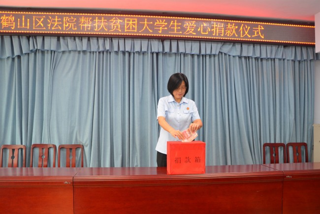 8月28日下午,鹤山区法院组织干警为帮扶村鹤壁集镇梨林头村的贫困大学生李某佳进行爱心捐款,用实际行动助力脱贫攻坚战役。