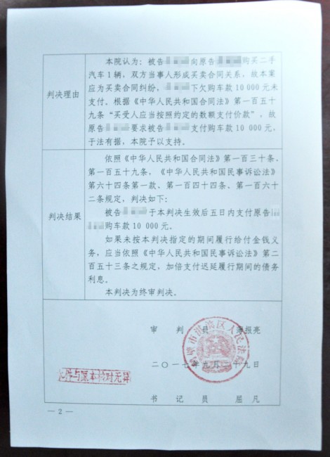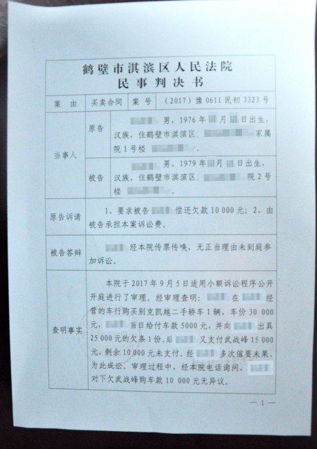 2017年9月29日,鹤壁市淇滨区法院制作并发出首份表格式民事判决书。这是一起买卖合同纠纷案件,诉讼标的为1万元,被告张某向原告吴某购买二手车一部,约定价款3万元,给付2万元后,下欠1万元多次催要未付,吴某无奈之下诉至法院。因该案事实比较清楚,权利义务关系明确,符合小额诉讼一审终审的条件,该案由院长薄报亮公开开庭审理。张某接到法院传票后无正当理由未到庭参加诉讼,薄报亮采用电话询问的方式向张某核实案情,依法确定案件事实,并采用表格式判决书的形式,判令被告张某五日内给付原告吴某购车款1万元,该判决为终审判决。
