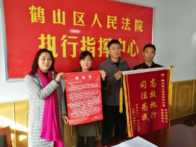 11月1日,鹤山区法院执行局将一起常年未结的刑事附带民事案件执行完毕。2017年11月2日上午,申请人苏某给执行局送来了锦旗和感谢信。