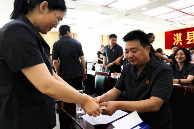 活动共有五项议程,首先由该院党组成员、政治处主任王毅宏传达学习了《淇县人民法院关于成立党风廉政建设领导小组的通知》和《中共鹤壁市委政法委员会关于学习贯彻政法领导干部学习贯彻习近平新时代中国特色社会主义思想专题研讨班精神的通知》,强调了全面从严治党、从严治院的工作任务和主体责任落实,对全院党员干警党风廉政建设和反腐败斗争提出了具体工作要求;随后,在该院党组副书记、副院长李培忠领誓下,全体党员干警面对党旗庄严宣誓:“我志愿加入中国共产党,拥护党的纲领,遵守党的章程,履行党员义务,执行党的决定,严守党的纪律,保守党的秘密,对党忠诚,积极工作,为共产主义奋斗终身,随时准备为党和人民牺牲一切,永不叛党”。为进一步增强党员干警“我是党员”的荣誉感和仪式感,还组织全体党员现场缴纳党费,相关工作人员对党费缴纳情况进行报告。活动丰富多彩,监察室干警张珂带来配乐诗朗诵《初心》,“在决战基本解决执行难的关键时刻 ,我们的执行干警,披星戴月,到处奔波,与时间赛跑,与老赖斗智斗勇,一笔笔案款,一个个不眠夜,一张张笑脸,如同院中种的向日葵一样明媚”;政治处干警张帆、新进干警陈鹏共同带来《天平之歌》,“面对犯罪我怒拍惊堂,面对苦难我亲身体量,营商环境因我而顺畅,生态环境因我而清爽,呵护妇女儿童我如春风浩荡,关爱弱势群体我如雪里热汤,我给民告官者以胆量,我给恶欺善者以耳光,我用行动一次次把天平擦亮”。最后,全体干警共同观看了廉政警示教育专题片《代价》,通过北京市地税局原党组书记、局长王纪平等三人违法犯罪后发自内心的反省和痛悔,生动地揭示了他们怎样从一个有抱负、有作为的领导干部一步步蜕变为腐败分子的悲情历程,深刻警示了党员干部职工特别是各级领导干部必须要树立正确的人生观、价值观和权力观,切莫重蹈覆辙。